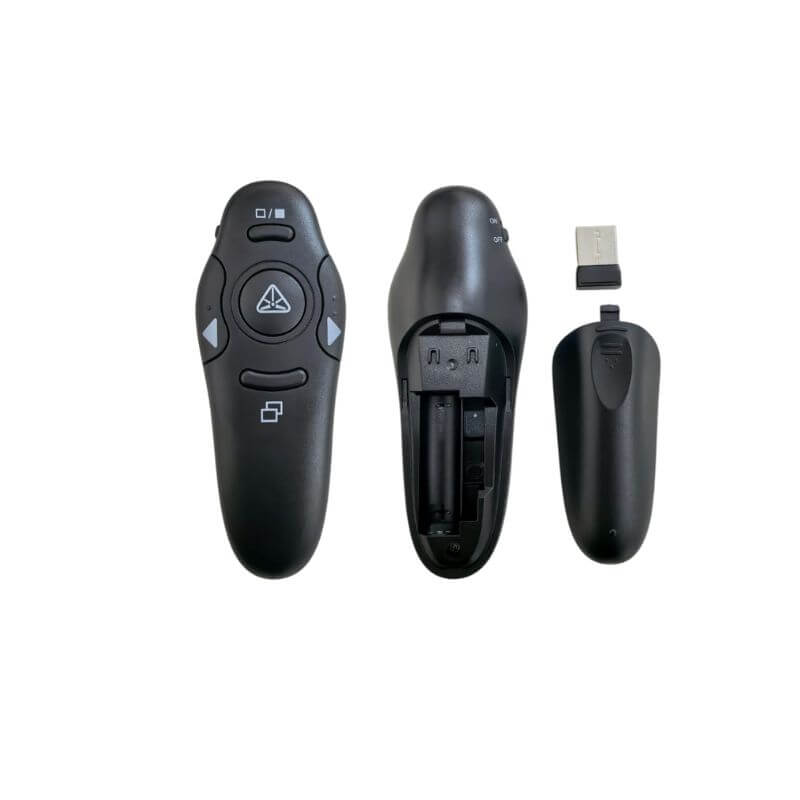 Este es un presentador inalámbrico multifuncional. Tiene dos modos: modo PPT y modo ratón. En el modo PPT, los botones pueden controlar la pantalla, las páginas y el láser. En el modo ratón, los botones funcionan como un ratón. Tiene un botón para cambiar entre los dos modos.